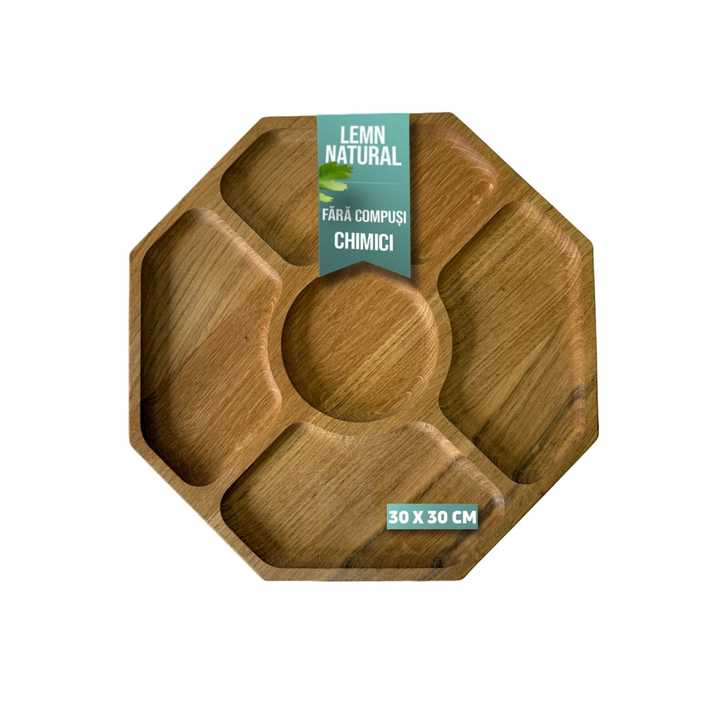 Suport servire octogonal cu 5 compartimente din lemn de stejar – rafinament, naturalete si functionalitate Un suport de servire nu este doar un obiect practic, ci si o declaratie de stil pentru orice masa. Varianta octogonala cu 5 compartimente, realizata cu atentie din lemn de stejar, ofera un echilibru perfect intre estetica si functionalitate. Dimensiunile de 30x30 cm il fac usor de utilizat in orice context, fie ca este vorba de mese relaxante alaturi de familie sau de momente festive petrecute cu prietenii. Prin forma sa eleganta si materialul de calitate, transforma orice prezentare culinara intr-o experienta memorabila.