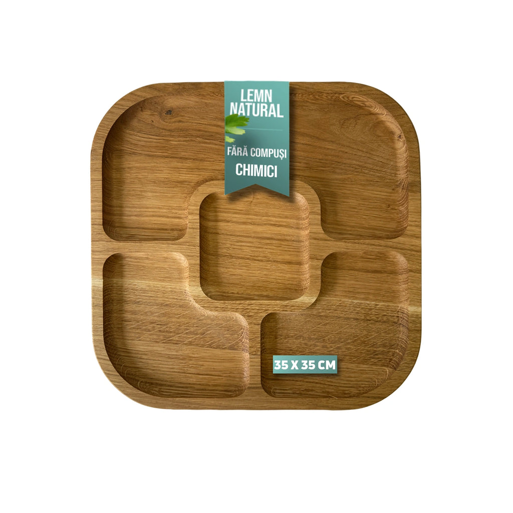 Suport servire patrat cu 5 compartimente din lemn de stejar – eleganta si functionalitate pentru momente speciale Un suport de servire realizat din lemn de stejar transmite imediat o senzatie de naturalete si autenticitate. Fiecare fibra a lemnului poarta o poveste unica, iar aspectul patinat si textura sa placuta la atingere transforma fiecare masa intr-o experienta de rafinament. Cu dimensiuni generoase de 35x35 cm, acest suport patrat cu 5 compartimente este conceput pentru a oferi un echilibru perfect intre estetica si functionalitate, fiind ideal pentru momentele petrecute in familie sau cu prietenii.