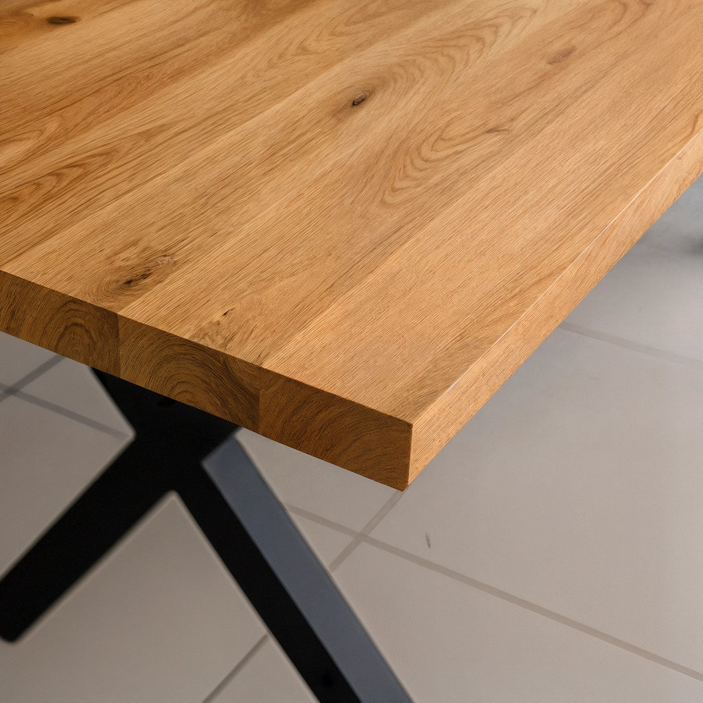 Discover the authentic beauty of a solid oak table, a true work of nature. Each rustic oak table top is unique, thanks to the natural texture and individual characteristics of the wood. Each crack, knot or color variation gives each table its own character. With a thickness of 4 cm, it offers not only resistance, but also a robust elegance. The table can have straight or natural edges (tree edges), for a more authentic and rustic look.