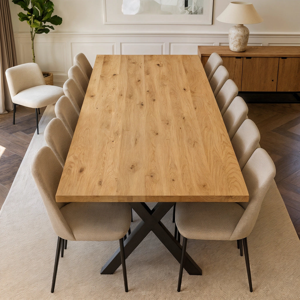 Discover the authentic beauty of a solid oak table, a true work of nature. Each rustic oak table top is unique, thanks to the natural texture and individual characteristics of the wood. Each crack, knot or color variation gives each table its own character. With a thickness of 4 cm, it offers not only resistance, but also a robust elegance. The table can have straight or natural edges (tree edges), for a more authentic and rustic look.