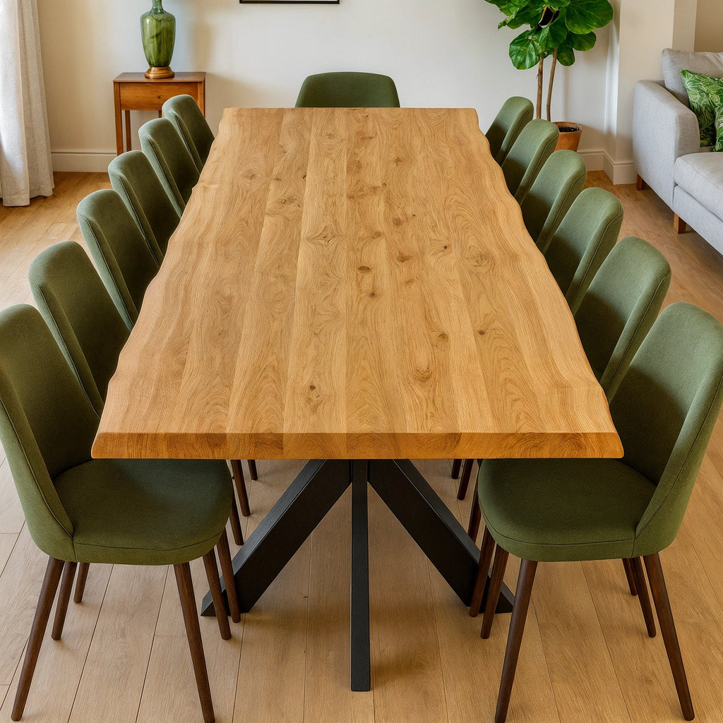 Discover the authentic beauty of a solid oak table, a true work of nature. Each rustic oak table top is unique, thanks to the natural texture and individual characteristics of the wood. Each crack, knot or color variation gives each table its own character. With a thickness of 4 cm, it offers not only resistance, but also a robust elegance. The table can have straight or natural edges (tree edges), for a more authentic and rustic look.