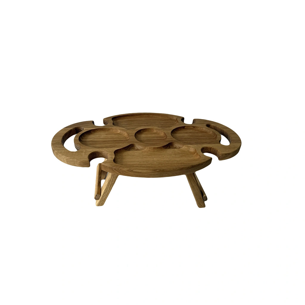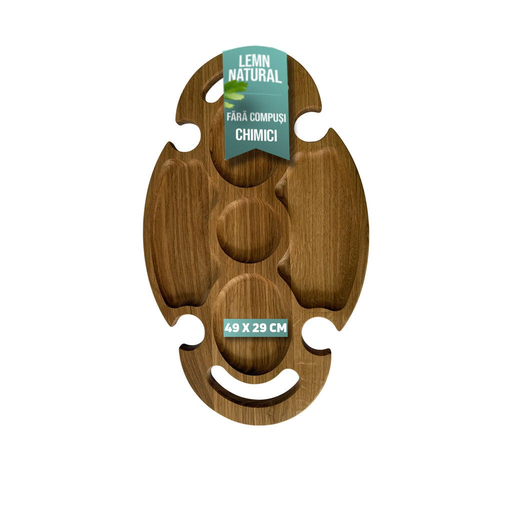 Platoul oval cu 5 compartimente, suport pentru pahare si picioare de sustinere este solutia ideala pentru servirea aperitivelor sau a gratarelor. Combinand durabilitatea lemnului de stejar cu designul practic si elegant, acest accesoriu transforma fiecare masa intr-un moment special, cu o prezentare atractiva si o utilizare confortabila. Fiecare detaliu, de la compartimentele bine definite la suportul pentru pahare si stabilitatea oferita de picioare, contribuie la crearea unei experiente complete, atat pentru gazda, cat si pentru invitati.