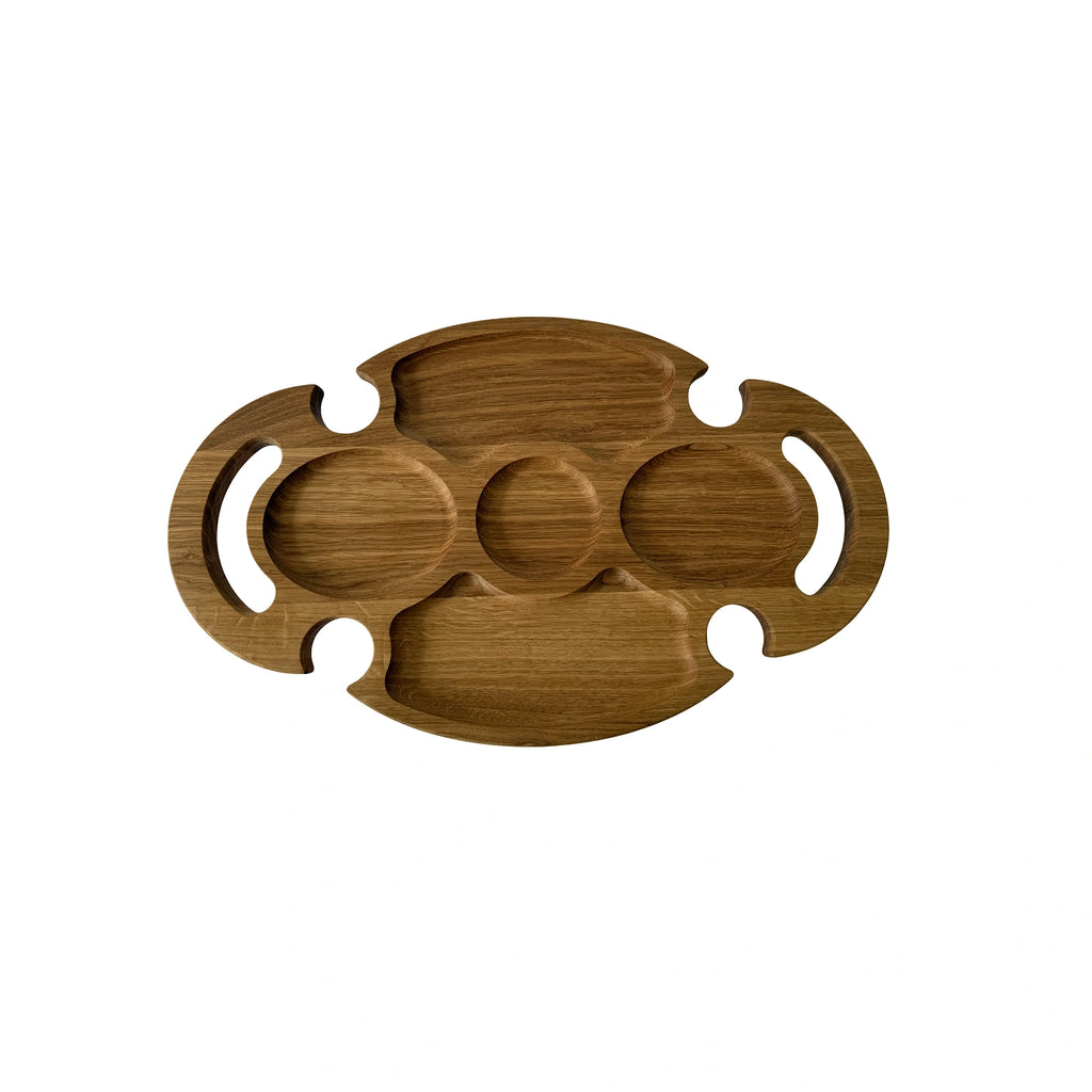 Platou oval din lemn de stejar cu 5 compartimente si suport pentru pahare