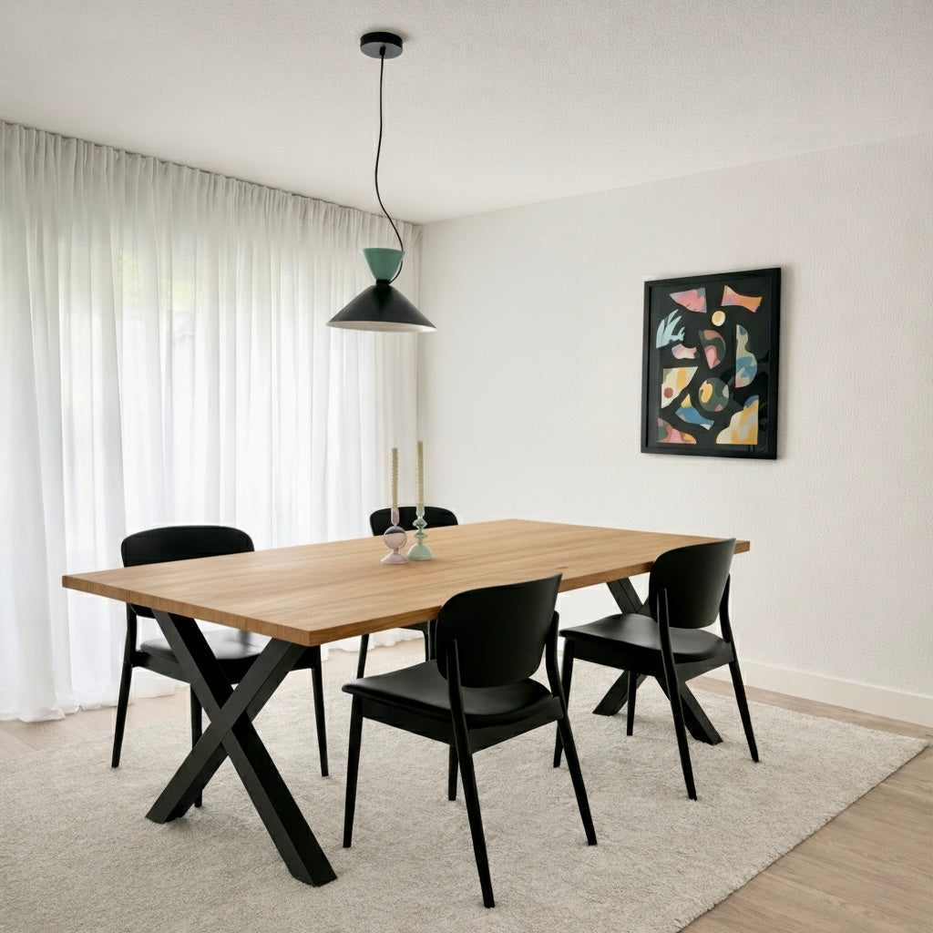Klasyczny stół wykonany z litego drewna dębowego to harmonijne połączenie naturalnego materiału z minimalistyczną, elegancką formą. Starannie dobrany dąb charakteryzuje się subtelnym usłojeniem i jednolitą kolorystyką, dzięki czemu stół doskonale wpisuje się w nowoczesne oraz klasyczne wnętrza.