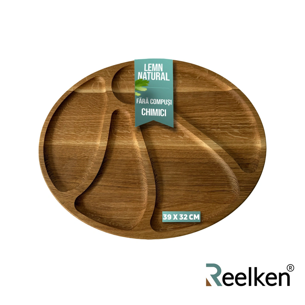Realizat din lemn de esenta selectata, acest platou pastreaza frumusetea unica a fibrei naturale, cu modele si nuante ce nu se repeta, oferind fiecarui produs un caracter distinct si personalitate proprie. Aspectul sau traditional il face potrivit atat pentru utilizarea in cadrul unor momente relaxante acasa, cat si pentru ocazii speciale, aducand o nota de caldura si naturalete in prezentarea gustarilor. Lemnul este prelucrat cu atentie pentru a obtine o suprafata neteda, placuta la atingere si usor de curatat, mentinandu-si rezistenta si frumusetea chiar si dupa o utilizare indelungata.