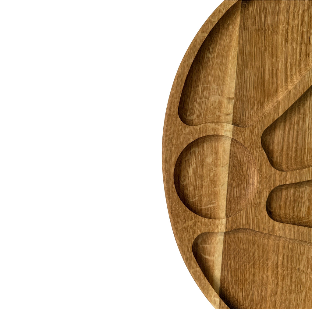 Acest suport, platou compartimentat din lemn, realizat cu inspiratie din designul traditional, este creat special pentru a aduce un plus de stil si rafinament momentelor in care sunt servite arahidele, alunele, nucile sau alte gustari. Confectionat din lemn de calitate, cu o suprafata neteda si calda la atingere, acest obiect imbina frumusetea naturala a materialelor autentice cu functionalitatea unui accesoriu conceput pentru a impresiona atat prin aspect, cat si prin utilitate. Fiecare detaliu, de la textura lemnului pana la forma compartimentelor, este gandit pentru a pune in valoare gustarile servite, creand o experienta placuta si memorabila pentru toti cei prezenti.