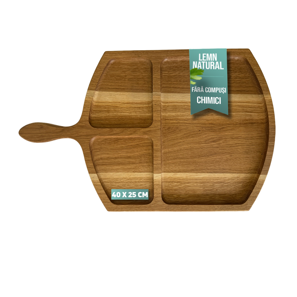 Suprafata din lemn masiv pastreaza textura naturala si nuanta calda a stejarului, aducand un aer autentic si rustic mesei tale. Trei compartimente distincte permit aranjarea alimentelor intr-un mod armonios si organizat, iar manerul adauga un plus de confort si practicitate. Acest platou poate fi folosit pentru prezentarea gratarelor suculente, a fripturilor delicioase sau a aperitivelor variate, fiind un element care atrage atentia si impresioneaza vizual.