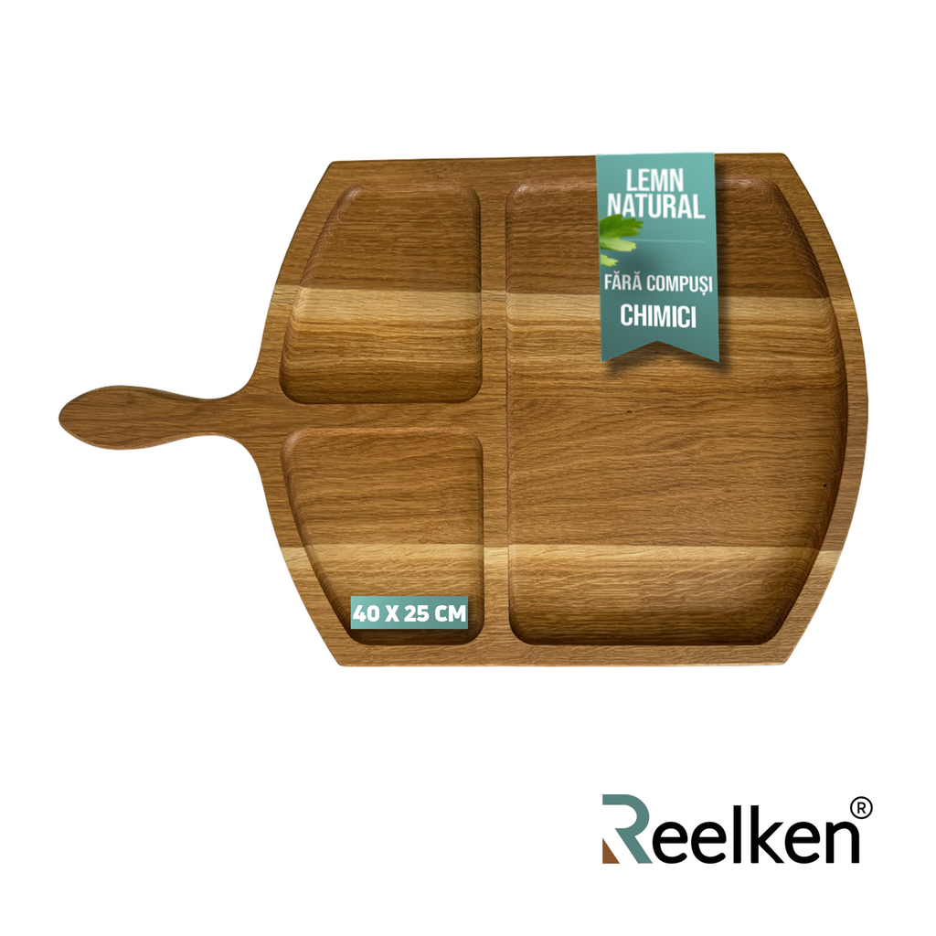 Platoul din lemn de stejar cu trei compartimente este ideal atat pentru mesele zilnice, cat si pentru evenimente speciale. Servirea gratarelor, fripturilor sau aperitivelor devine mai simpla si mai atractiva, iar prezentarea alimentelor capata un impact vizual placut. Acest suport poate fi utilizat pentru momente relaxante in familie sau pentru intalniri cu prietenii, fiind un instrument de servire care combina functionalitatea cu stilul natural al lemnului.