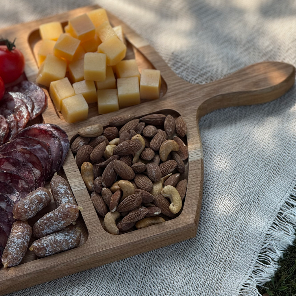 Indiferent daca vrei sa servesti o masa in familie, o cina cu prietenii sau un eveniment mai formal, suportul din lemn de stejar se adapteaza nevoilor tale. Compartimentele permit separarea diferitelor tipuri de alimente, iar manerul faciliteaza transportul fara efort. Acest platou poate fi folosit pentru gratare, fripturi, aperitive sau chiar pentru branzeturi si fructe, oferind flexibilitate si comoditate in fiecare situatie.